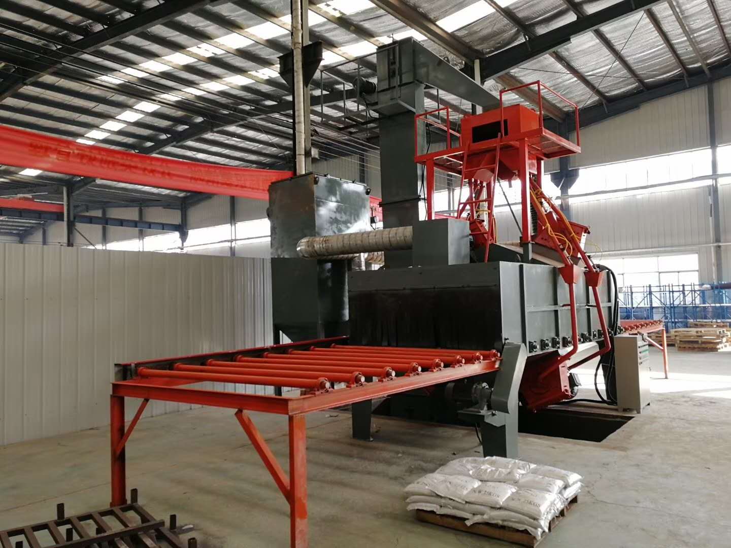 辊道式抛丸机主要用于建筑等行业。用于大型工字型钢、H型钢尺寸较高的钢结构件应力及表面除锈清理。辊道通过式抛丸机,清理过程中由电气控制的可调速输送辊道将钢结构件或钢材送进清理机室体内抛射区,其周身各面受到来自不同坐标方位的密集弹丸打击与磨擦,使之其上的氧化皮、锈层及其污物脱落,钢材表面就获得 粗糙度的光洁表面,在清理室外两边进出口辊道装卸工件。落入钢材上面的弹丸与锈尘,经吹扫装置吹扫,撒落下来的丸尘混合物由回收螺旋输送到室体漏斗、纵横向螺旋输送机汇集于提升机下部,再提升到机器上部的分离器里,分离后的纯净弹丸落入分离器料斗中内,供抛丸循环使用。抛丸清理中产生尘埃,由抽风管送向除尘系统,净化处理后的净气排放到大气中,颗粒状尘埃被捕捉收集。